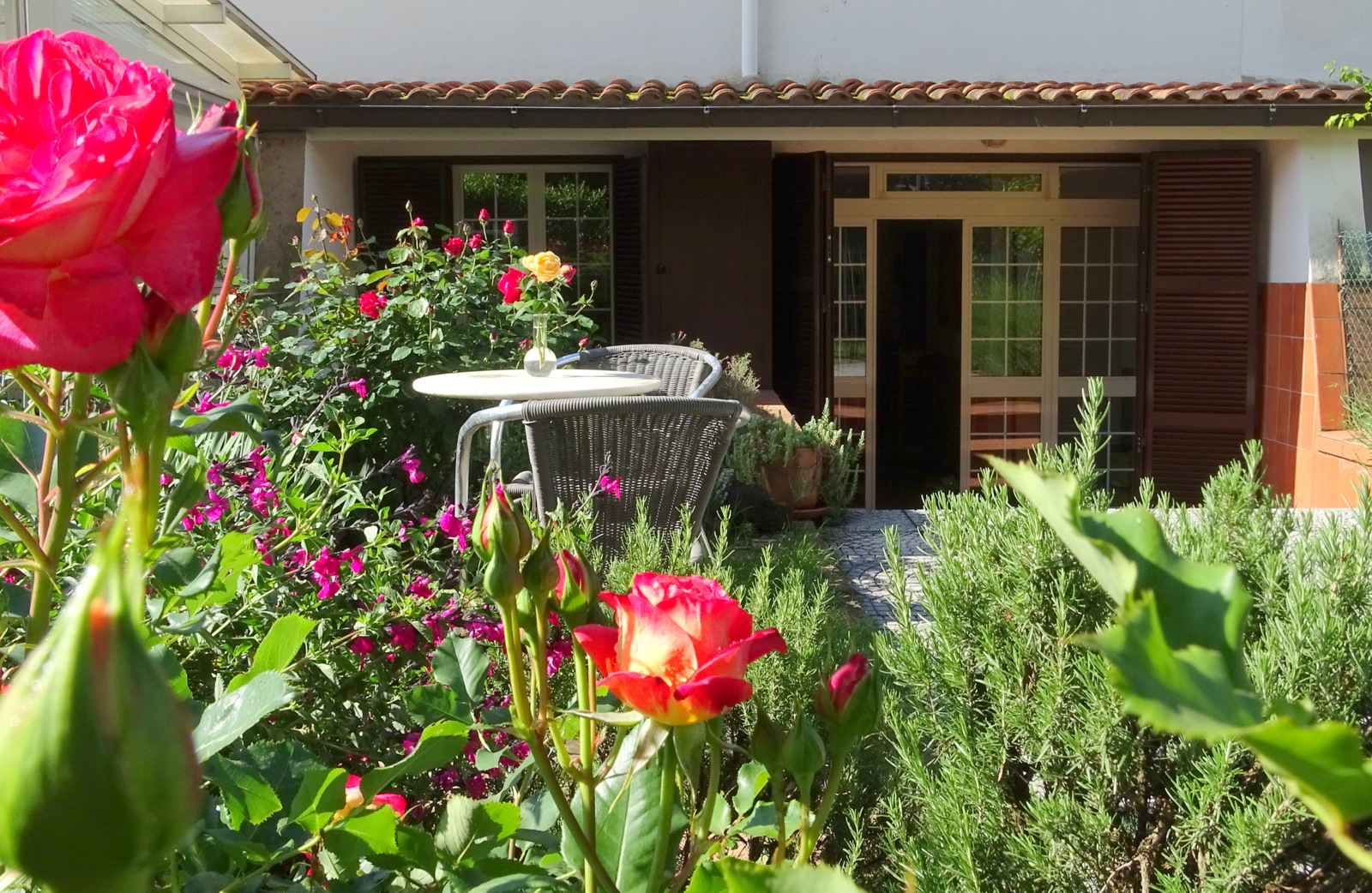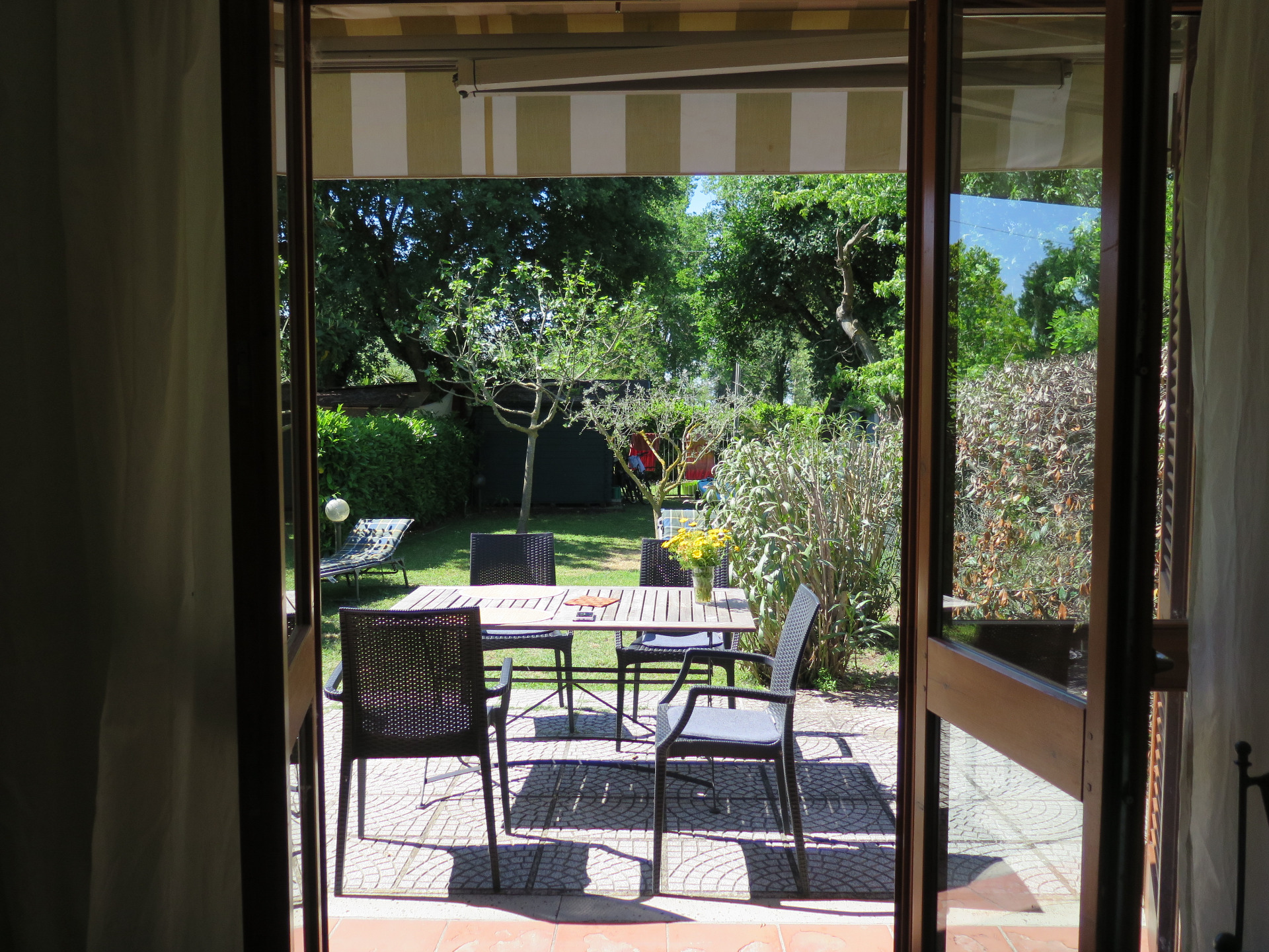 Blick vom Wohnzimmer auf Terrasse , Garten Blickrichtung See, Garten mit Blick auf Terrasse