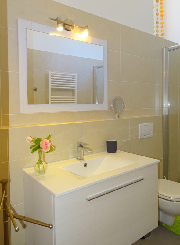 Durch den Vorgarten gelangt man in die großzügige Küche, ausgestattet mit Geschirrspüler und Waschmaschine. Auf dieser Ebene befindet sich außerdem eine Toilette. Wenige Stufen höher ist der Wohnbereich mit Sofas, Fernseher (Satellit + DVD), gut gefülltem Bücherregal und CD-Player. Von hier geht's auf die Terasse und in den hinteren Garten. Gartenmöbel - Tische, Stühle und Sonnenliegen -sind reichlich vorhanden. Die zwei Schlafzimmer und das Bad mit Dusche sind im Obergeschoss.